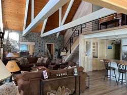 A modest 334 SF addition and strategic improvements greatly enhance this existing mountain cabin. The dining room in the expansion features an elevated ceiling, a generous bay window and doors affording connection to the front and rear decks in the warmer months. The kitchen, reoriented to span between the existing house and addition, hosts an oversized island that becomes the heart of the home. Focused investments including replacing the staircase and railing leading to a loft, new flooring, plus repainting the exposed beams and loft framing make spaces feel brighter and better connected to one another, cohesive with the addition and without extensive renovation of the existing area.